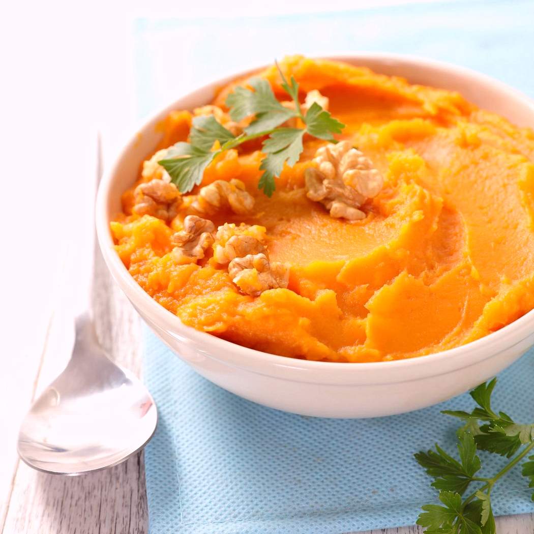 Drain the cooked sweet potatoes, add butter, a little milk, a pinch of nutmeg, salt and ground black pepper to taste. Then blend everything into a smooth puree. Add the milk gradually so that the puree is not too thin.