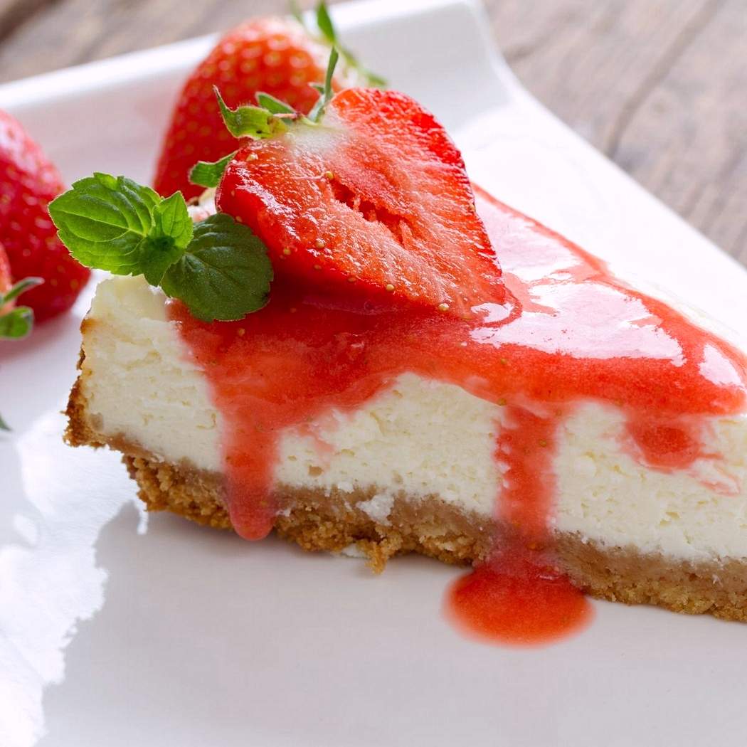 Traditional strawberry cold cheesecake made with homogenized cheese and gelatin